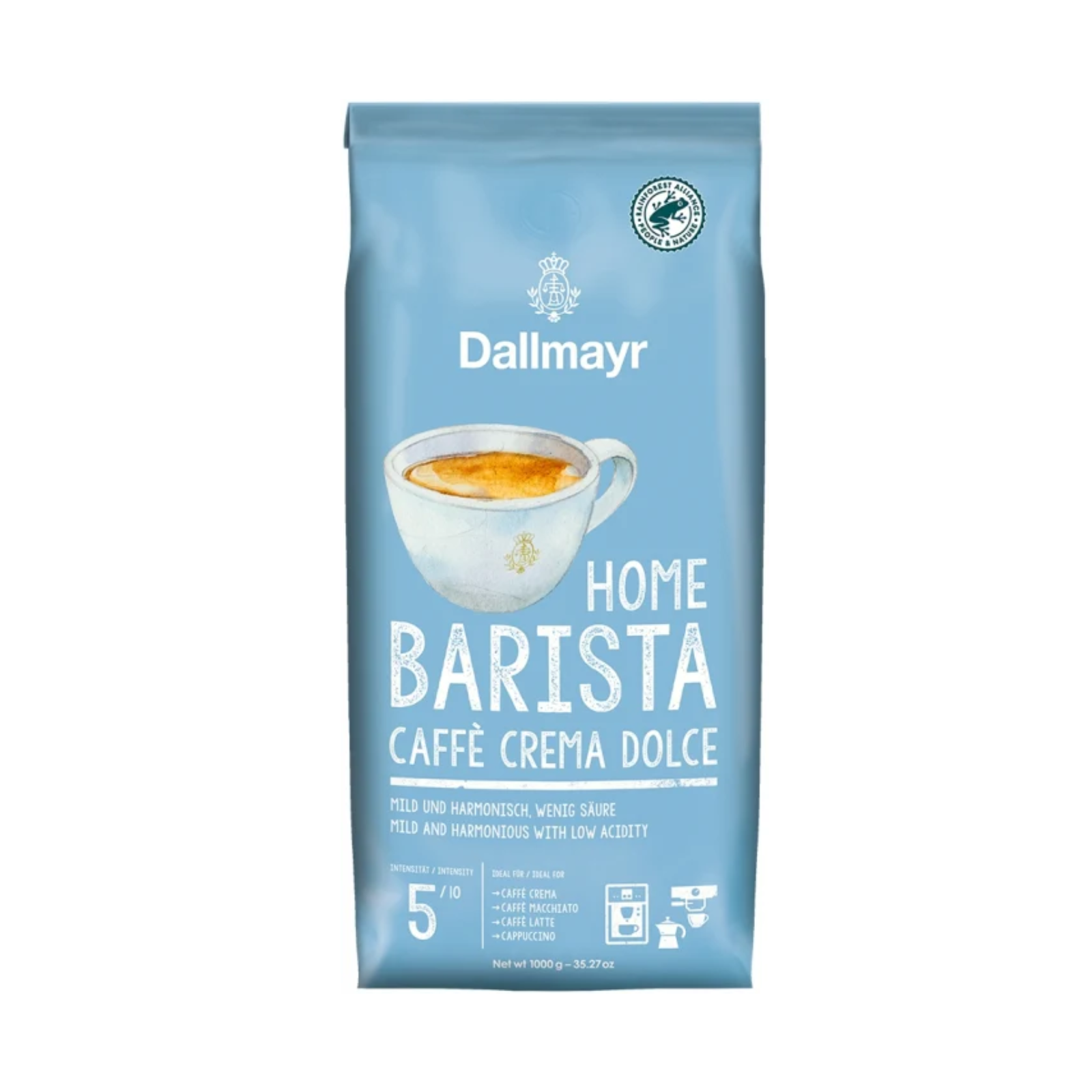 Crema densă, catifelată și brun-aurie face din această Caffè Crema, preparată acasă, o adevărată plăcere. Boabele de cafea din culturi sustenabile sunt prăjite nu foarte puternic, însă timp îndelungat, pentru a obține gustul delicat și armonios, la o aciditate redusă. Acestuia i se adaugă o aromă fină, de nuci.
