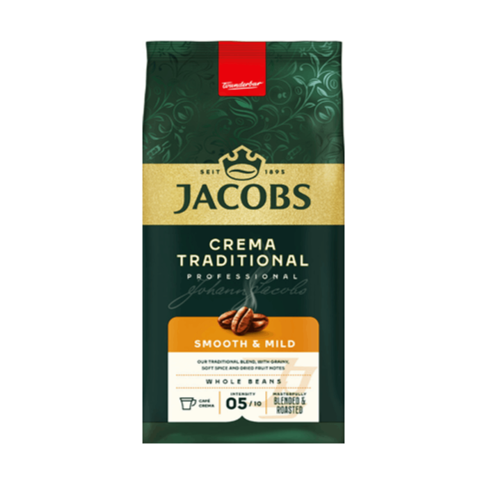 Jacobs Crema  Traditional este o cafea boabe cu aromă intensă, gust echilibrat și prăjire medie, ideală pentru espresso, vending, HoReCa și uz casnic.