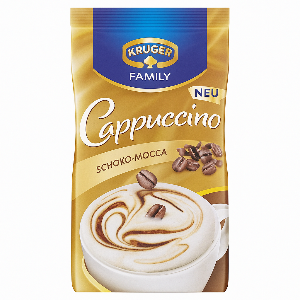 Plăcerea cappuccino cu ciocolată. Cu deliciosul mocca de ciocolată cappuccino tip Kruger Family, evoci o băutură caldă aromată pentru tine și invitații tăi în cel mai scurt timp. Cappuccino-ul te seduce cu o notă de ciocolată corpolentă și asigură momente irezistibile de bucurie.