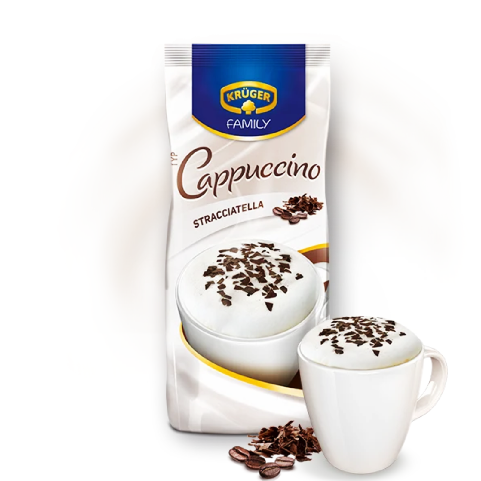 Savurează aroma irezistibilă a Cappuccino Krüger Stracciatella, combinația perfectă între cafea și ciocolată.